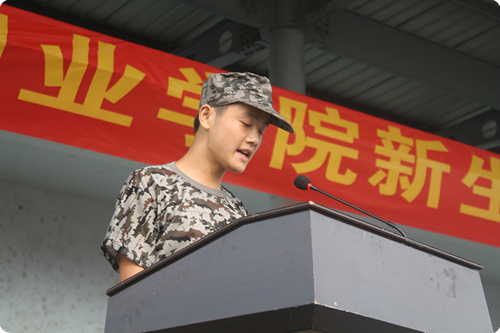 建筑工程系2012级建工专业的向元奎同学代表参训学生发言,表示要圆满完成军训任务。