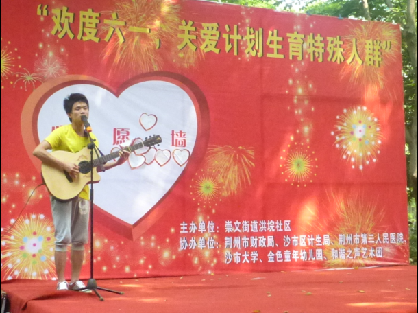 此次公益活动吸引了众多人的眼球,过往的老人、年轻人、小孩,也纷纷过来围观。孩子们都沉浸在节日愉悦的氛围里。活动在由金书记、沙市区计生局局长舒艳春的精彩致辞中拉开帷幕。学院经管系原创歌手谢曲龙表演了原创歌曲《有你、有我、有他》,真实的语句不夹杂半点虚假、美妙的曲调和深情的演唱,将他的才华显现的淋漓尽致,也将在场所有人的的感情控制于鼓掌,"我们永远与你们同在。"最后在一首《相亲相爱》中本次活动圆满结束。