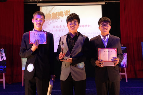 在比赛过过程中,选手们各显神通,经过激烈的角逐,最终,苏道鑫(经济管理系)荣获第一名;雷明杰(人文与社会科学系)荣获第二名;夏冲(信息与智能工程系)荣获第三名;韩筱雨(人文与社会科学系)荣获最佳表演奖;张健(化学与建筑工程系)荣获最佳人气奖;莫闰杰、杨丹月、付天天、程霜、韩筱雨、胡佳凡荣获优秀奖;机械工程系荣获"优秀组织奖"。