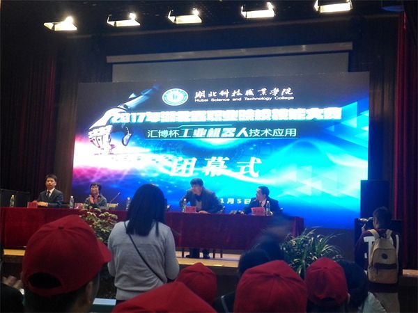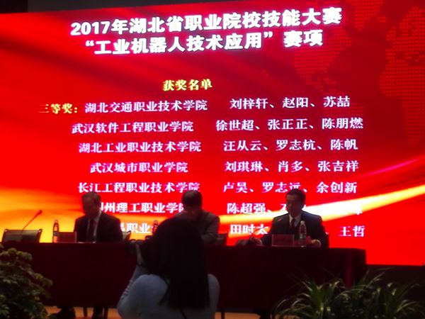 2017年11月5日,湖北省职业院校技能大赛(高职组)"工业机器人技术应用"赛项在湖北科技职业学院学术报告厅圆满闭幕。经过两天激烈角逐,我校2016级工业机器人技术专业学生陈超强、石鹏、王俊峰三位同学通过团队配合,努力拼搏,在本次比赛中取得了三等奖的好成绩。