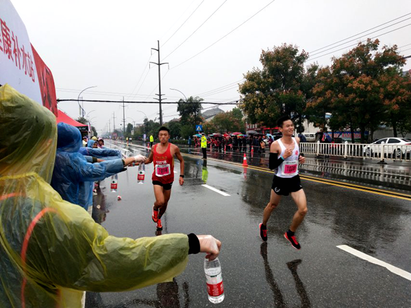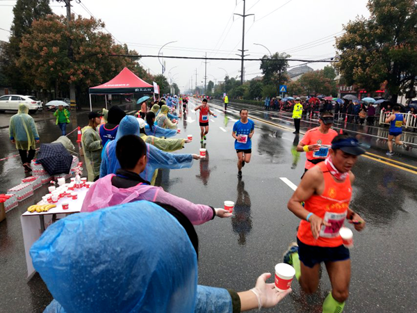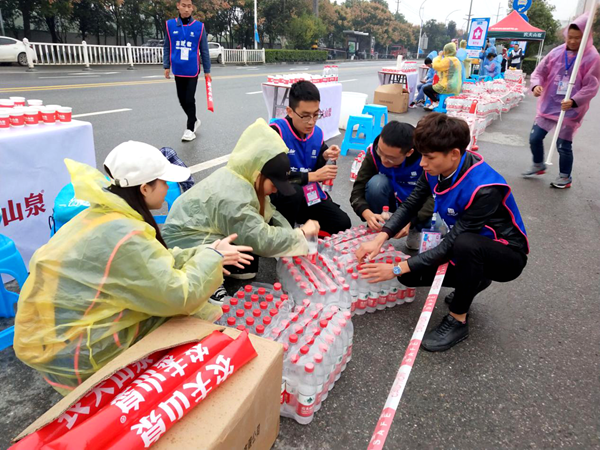 零晨四点的天空飘着小雨,同学们早已做好了各项准备,奔赴各自的服务岗位,他们就像一个个精灵,照亮了城市的夜空。志愿者用实际行动为马拉松运动健儿们助威加油,他们手中递出的水杯转化成运动员继续前进的能量补给,他们响彻长空的呐喊加油声凝结成运动员心底坚持到底的精神力量。