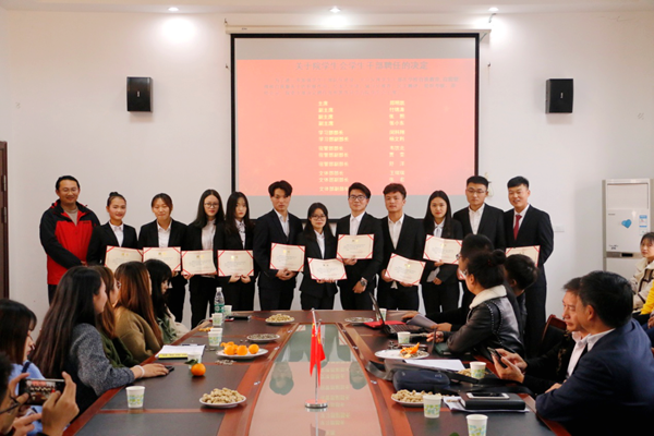 11月27日下午,商学院会议室充满温馨而祥和的气氛,商学院党支部书记何先华、院长向辉、副书记詹庆娟、副院长胡青华、分团委书记王路鸣、王晓黎老师、张姣老师及16级、17级学生干部等齐聚一堂,召开学生干部送老迎新暨新一届学生干部聘任大会。