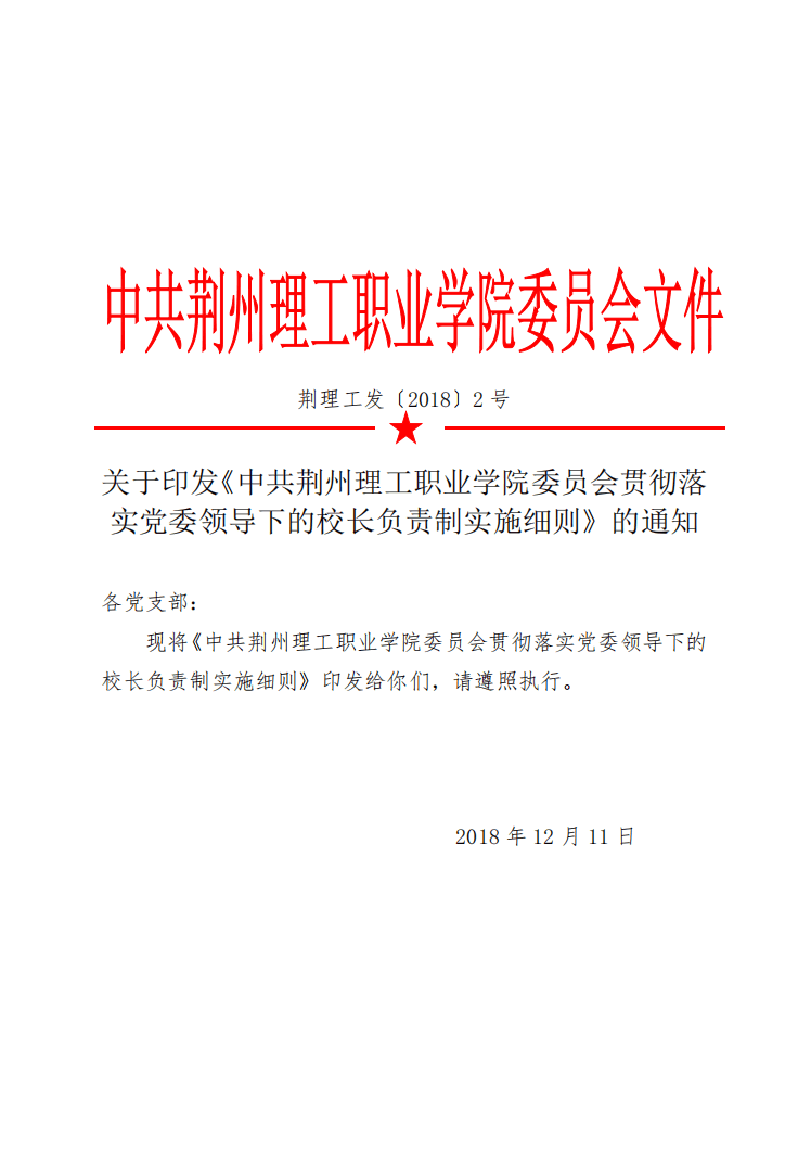 关于印发《中共荆州理工职业学院委员会贯彻落实党委领导下的校长负责制实施细则》的通知