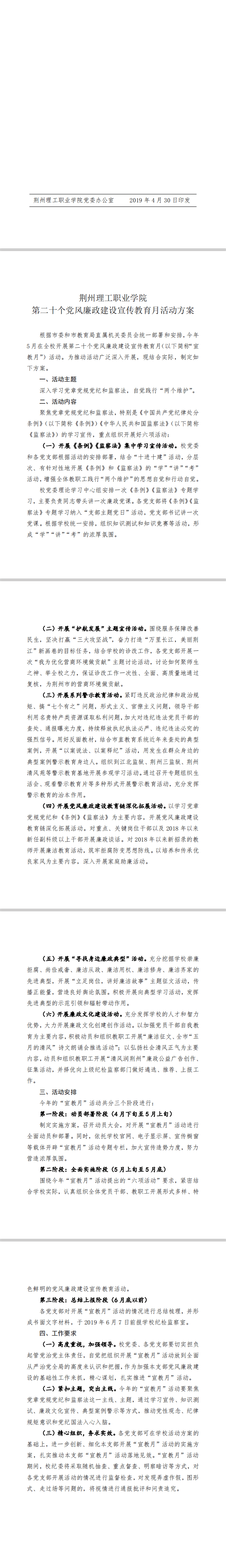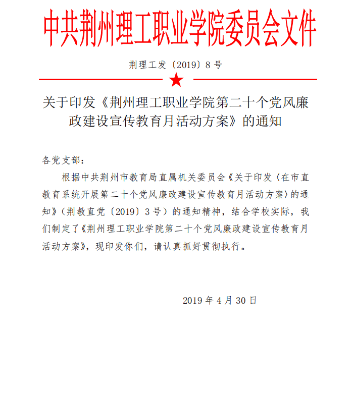 关于印发《荆州理工职业学院第二十个党风廉政建设宣传教育月活动方案》的通知