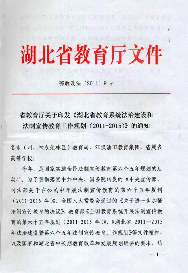 为贯彻落实中共中央、国务院转发的《中央宣传部、司法部关于在公民中开展法制宣传教育的第六个五年规划(2 011-2 015年)》(中发[2011]6号)、全国人大常委通过的《关于进一步加强法制宣传教育的决议》、教育部《全国教育系统开展法制宣传教育的第六个五年规划(2 011-2 015年)》(教政法[2011]13号)、湖北省委省政府《湖北省2 011-2 015年法治建