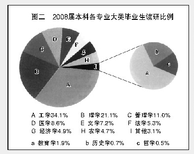 按教育部公布的数据,2008届高校毕业生总数为559万,其中大学毕业生总数约为529万(本、专),按本研究得出的比例推算,2008届大学毕业生毕业后就在国内外读研究生的人数为21.43万,毕业半年后的就业人数约为434万。在毕业半年后的73.56万失业大学毕业生中(包括有了工作又失去的),有51.59万人还在继续寻找工作,有5.46万人无业但正在复习考研和准备留学,另有16.51万没有求职和求学行为者(即所谓的啃老族,该报告中定义为待定族)(见图一、图二)。