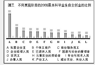 调查结果表明,2008届大学毕业生中,来自"私营企业主"、"企业经理人员"、"个体工商户"等家庭的毕业生自主创业比例最高(见图三)。大学毕业生创业受其家庭的企业家文化影响较大。而且,其创业资金82%以上依靠父母、亲友和个人储蓄,来自商业性风险投资和政府资助的只占1%。所以,有创业意愿但家庭经济条件不好的毕业生就不容易实现创业梦想,政府需要在启动资金方面帮助经济困难的创业者。