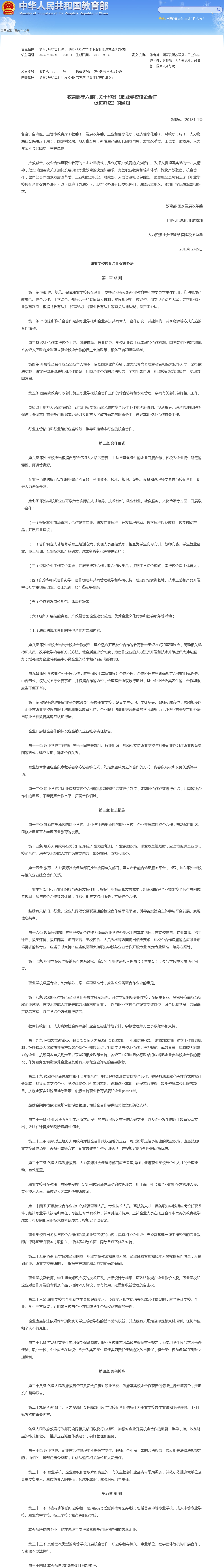 教育部等六部门关于印发《职业学校校企合作促进办法》的通知