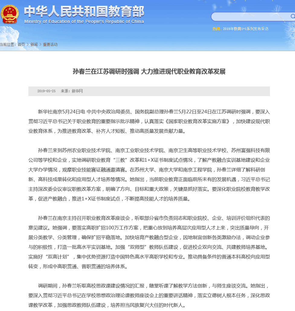 上一篇 : 李克强对全国深化职业教育改革电视电话会议作出重要批示
