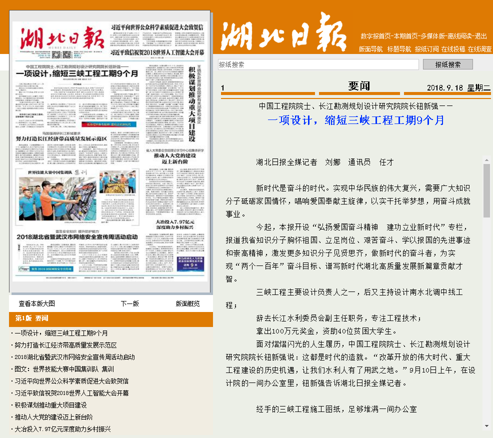 【湖北日报】“弘扬爱国奋斗精神、建功立业新时代”系列报道(二)——中国工程院院士、长江勘测规划设计研究院院长钮新强——一项设计,缩短三峡工程工期9个月