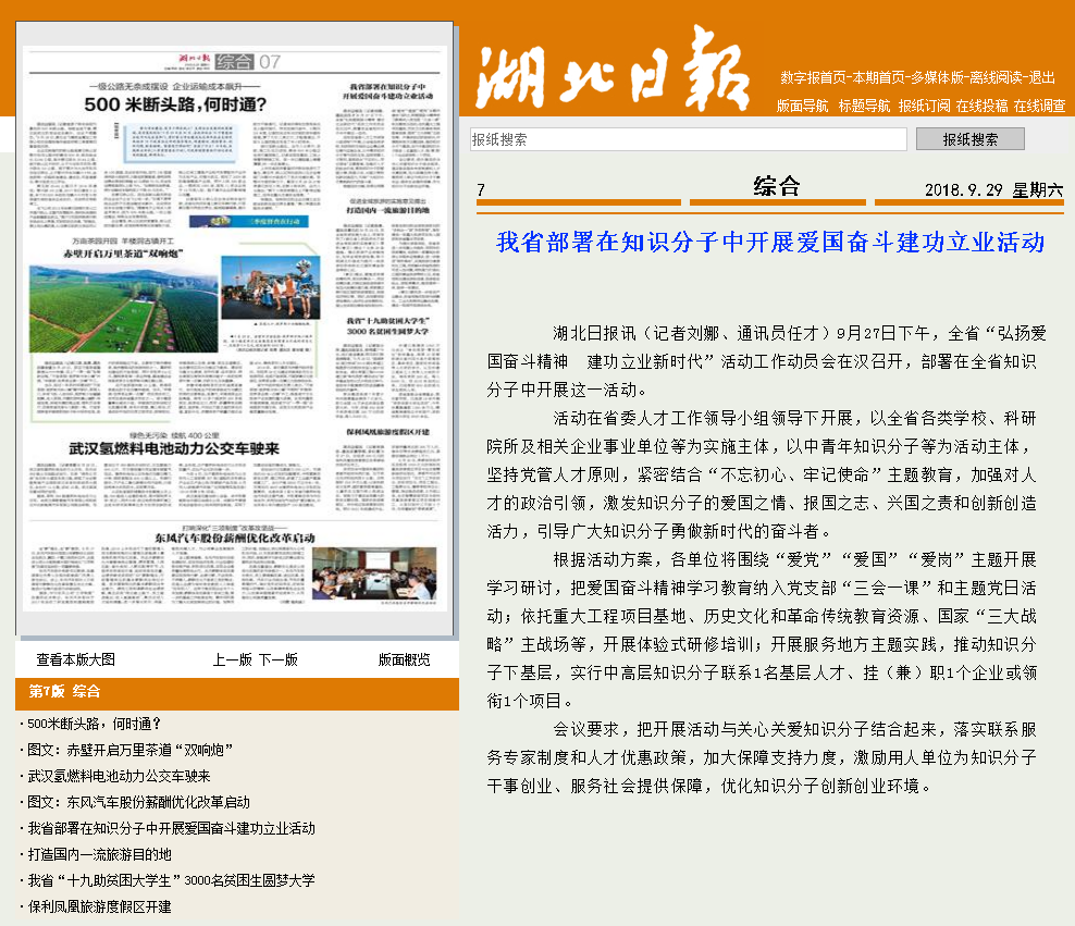 【湖北日报】“弘扬爱国奋斗精神、建功立业新时代”系列报道(三)——我省部署在知识分子中开展爱国奋斗建功立业活动