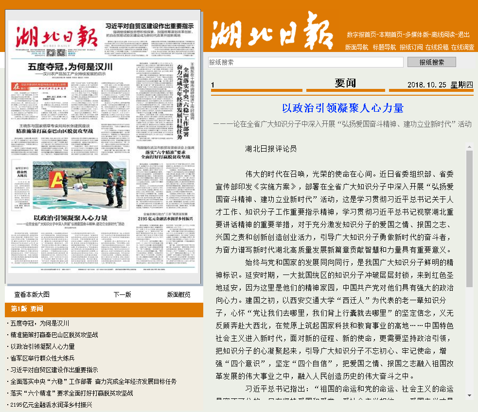 【湖北日报】“弘扬爱国奋斗精神、建功立业新时代”系列报道(六)——湖北日报刊发评论员文章:以政治引领凝聚人心力量——一论在全省广大知识分子中深入开展“弘扬爱国奋斗精神、建功立业新时代”活动