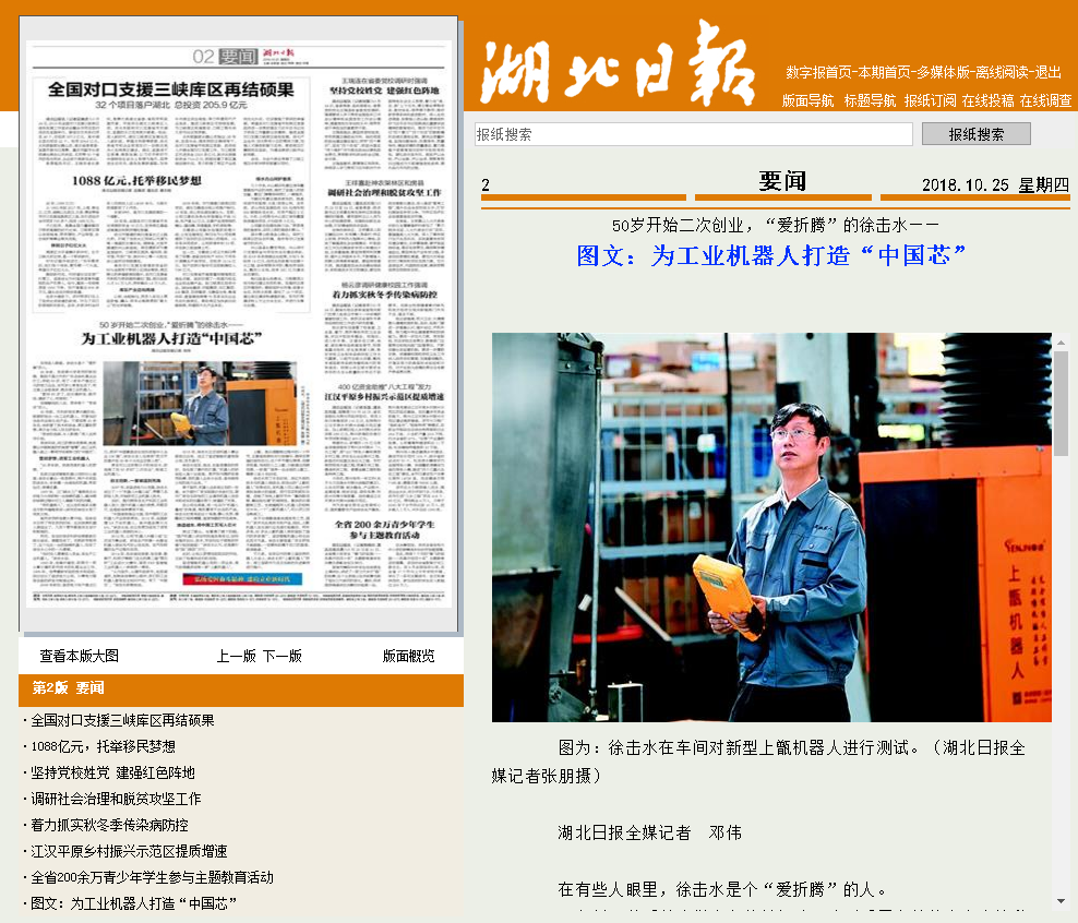 【湖北日报】“弘扬爱国奋斗精神、建功立业新时代”系列报道(七)——50岁开始二次创业,“爱折腾”的徐击水——图文:为工业机器人打造“中国芯”