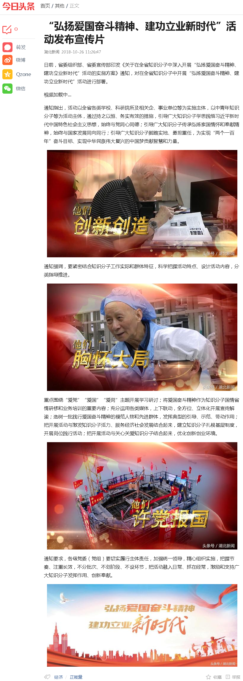 【今日头条】“弘扬爱国奋斗精神、建功立业新时代”系列报道(十三)——10月24日、27日、28日,《湖北新闻》:播放“弘扬爱国奋斗精神、建功立业新时代”活动宣传片