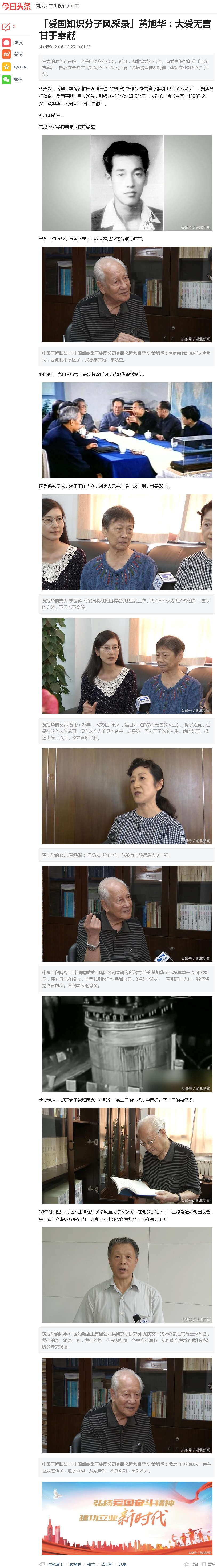 【今日头条】“弘扬爱国奋斗精神、建功立业新时代”系列报道(十四)——10月24日,《湖北新闻》:“新时代新作为新篇章·爱国知识分子风采录”系列报道第1集《中国“核潜艇之父”黄旭华:大爱无言甘于奉献》
