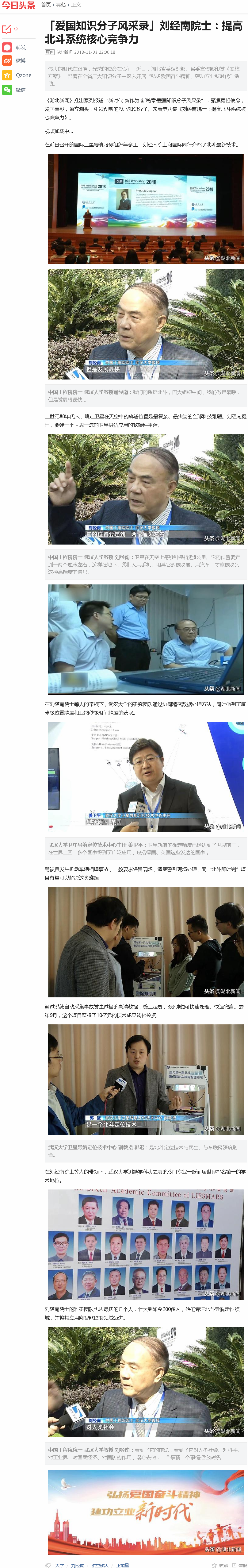 【今日头条】“弘扬爱国奋斗精神、建功立业新时代”系列报道(二十一)——11月3日,《湖北新闻》:“新时代新作为新篇章·爱国知识分子风采录”系列报道第8集《刘经南院士:提高北斗系统核心竞争力》