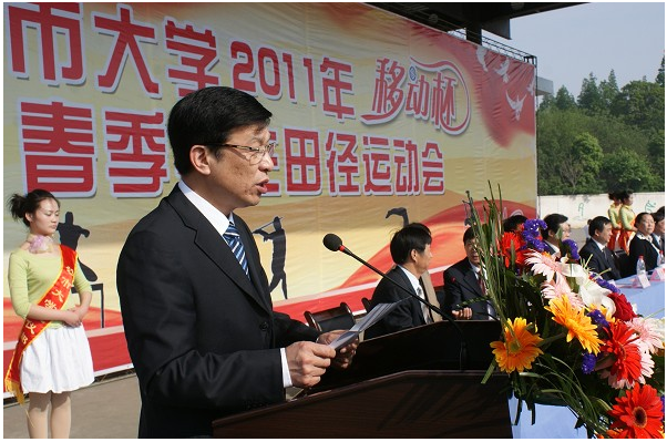 在鸣炮奏乐声中,院长童应学宣布我院2011年春季田径运动会开幕。
