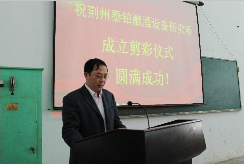 院长童应学致辞,向泰铂酿酒设备研究所的成立表示衷心地祝贺,他说:今天荆州泰铂酿酒设备研究所的成立,标志着我院机械工程系在校企合作,共建"校中厂、校中所",建设"生产性实训基地"的路子上迈开了新的一步,学院高度重视与荆州泰铂酿酒设备有限公司的合作,愿意保证和提供开展合作相关工作的一切便利条件。希望荆州泰铂酿酒设备研究所在今后的工作中,按照"专业与产业对接、课程内容与职业标准对接、教学过程与生产过程对接、学历证书与职业资格证书对接、职业教育与终身学习对接"的思想,集"教学、培训、生产、技术开发与服务"四大功能"为一体,在校企"产、学、研"合作项目上,充分发挥双方的智力优势和资源优势,创造更多的新产品新成果;在机械类专业的人才培养工作中,大胆创新,探索出符合我院实际的新思路新方法;尤其是在机械类专业学生"教、学、做"一体化的实践中,突出开放性,为学生技能训练、技能竞赛、技能考核鉴定、创业就业训练服务,为教师培训提高服务,贴近生产、贴近技术、贴近工艺,培养更多更强的"双师型"教师,让学生得到跟多锻炼更多实惠。