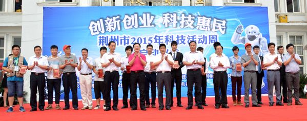 院长童应学同志(左二)出席启动仪式并为"荆州市十佳大学生科技创新之星"颁奖