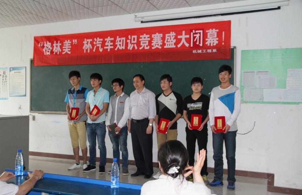 2014年5月20日16:00机械工程系"格林美杯"汽车知识竞赛闭幕式暨颁奖典礼在科教楼306隆重举行,学院童应学院长、田远芬副院长、吴燕处长、杨卫国主任、陈安志书记亲临会场。在主持人激情而流畅的开场白中,宣布汽车知识竞赛闭幕式暨颁奖典礼正式开始,随后由机械工程系陈书记宣布本次汽车知识竞赛的获奖名单,童院长分别为各组获奖选手颁奖并合影。在同学们的热烈掌声中,我们聆听了童院长、杨主任的亲切讲话,在投以热烈而持久不息的掌声中,透示了院系领导、老师对汽车专业学生活动倾注关爱、谆谆教诲的热烈反馈。最后,全体师生与院系领导在科教楼前合影留念,给本次汽车知识大赛画上完美句号。