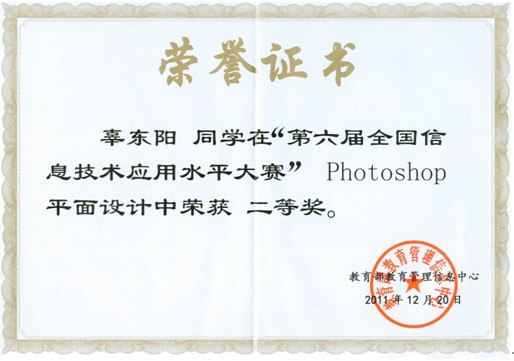 12月20日,由教育部教育管理信息中心主办的第六届全国信息技术应用水平大赛颁奖典礼在北京大学百年纪念讲堂举行,我院2009级信息工程系辜东阳同学在高元华老师的指导下,经过层层选拔入围决赛,并最终获得了"Photoshop平面设计组"全国二等奖的好成绩。赛后辜东阳同学激动的说:"几年的汗水换来今天的喜悦,真心感谢培养我的老师,也会铭记学院给我的一切,谢谢!"。