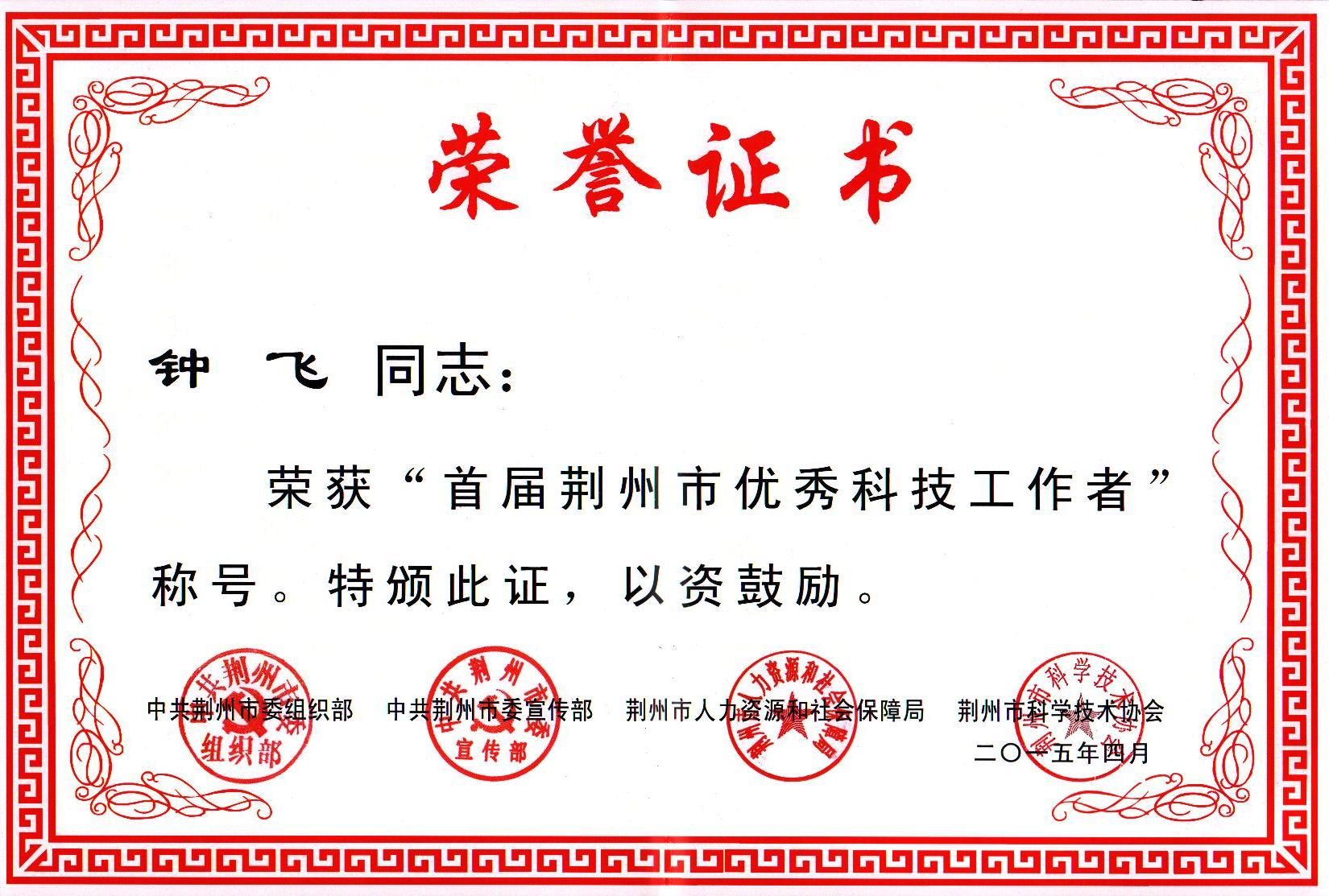 我系钟飞同志荣获“首届荆州市优秀科技工作者”称号