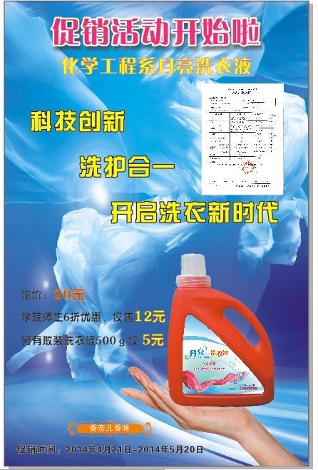 日前,由我系师生共同研发的洗衣液、沐浴液、洗发水等日用系列产品已陆续投入生产,首款高科技产品月亮洗衣液现隆重登场,为感谢广大师生的关心与支持,特在校园内以服务师生为主题,开展月亮洗衣液促销活动。