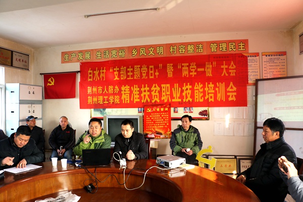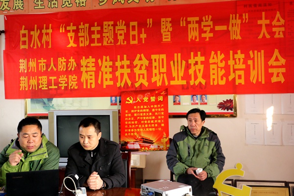 按照荆州市人防办党组、荆州理工职业学院党委关于在精准扶贫点开展十八届六中全会宣讲的部署,12月15日,荆州市人防办、荆州理工职业学院精准扶贫精准脱贫工作队在扶贫点沙市区锣场镇白水村举行"支部主题党日+两学一做"大会暨精准扶贫精准脱贫职业技能培训大会,切实把宣讲党的十八届六中全会精神和精准扶贫工作紧密结合起来,帮助乡亲们提升生产技能,早日脱贫致富。