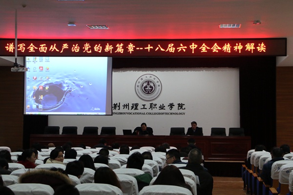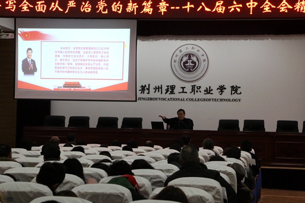 为深入推进学习贯彻党的十八届六中全会精神,13日下午,我校邀请长江大学党委常委、副校长李家宝教授到我校学术报告厅作专题宣讲,解读十八届六中全会精神。宣讲会由我校党委副书记黄永平主持,纪委书记黄勇、副校长龚恒出席会议。