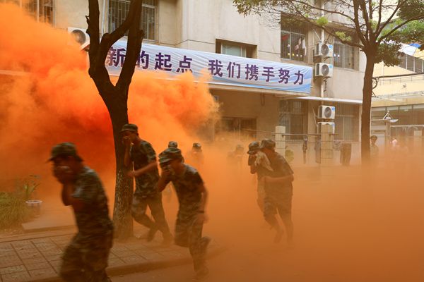 当日下午15时,在听到火灾警报声后,参与应急演练的学生立即用湿毛巾捂住口鼻,弯腰跑出宿舍楼,向消防应急灯指示的方向,迅速、有序地撤离,整个撤离过程仅用了3分钟左右的时间。应急疏散演练结束后,消防官兵在军训场上向师生讲解了灭火器的使用方法,并由新生亲身体验参与了演示。