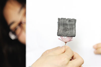 一块100立方厘米的"全碳气凝胶"放在一朵花上的展示。新华社记者鞠焕宗摄