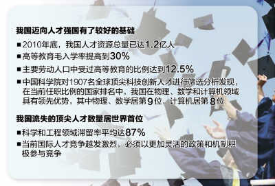 但是,我国流失的顶尖人才数量居世界首位,其中科学和工程领域滞留率平均达87%。这位负责人强调,我国人才队伍的规模、结构和素质等与世界先进国家和经济社会发展需要相比,还有很多不适应的地方,特别是高层次创新型人才匮乏,人才创新创业能力不强,人才结构和布局不尽合理,人才发展体制机制障碍尚未消除,人才资源开发投入不足,"这些都需要我们在实施人才强国战略中予以重视并加以解决"。