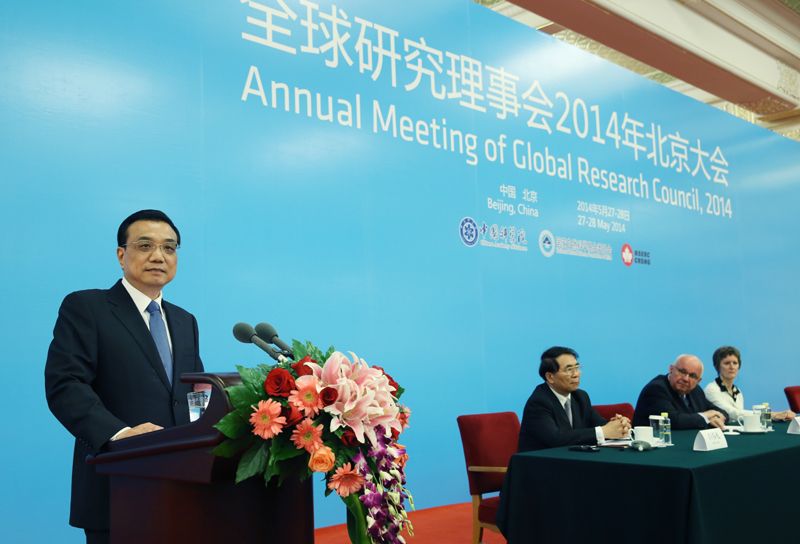 国务院总理李克强27日上午在人民大会堂出席全球研究理事会2014年北京大会开幕式并致辞。