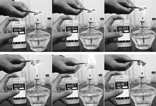 科研人员在实验室内对比展示"耐火纸"的特性,"耐火纸"在酒精灯的火苗上滞留近30秒没有发生自燃(上图):而普通纸张顷刻间被酒精灯点燃,从完好状态到化为灰烬仅用时6秒左右(下图)。