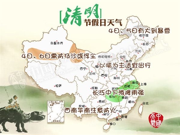不过,进入21世纪以来清明雨又多了起来。特别是北京,2001~2010年清明节降水次数已经和杭州、南京、武汉一样多。尤其是2010年以后,全国总体上清明节下雨的情况似乎还在增多。2011年~2014年的清明节,不仅是南方,北方不少地区也出现了清明雨。