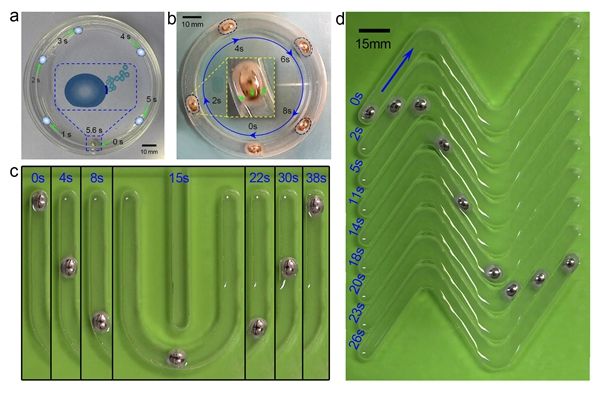 研究揭示,置于电解液中的镓基液态合金可通过"摄入"铝作为食物或燃料提供能量,实现高速、高效的长时运转,一小片铝即可驱动直径约5 mm的液态金属球实现长达1个多小时的持续运动,速度高达5cm/s。这种柔性机器既可在自由空间运动,又能于各种结构槽道中蜿蜒前行;令人惊讶的是,它还可随沿程槽道的宽窄自行作出变形调整,遇到拐弯时则有所停顿,好似略作思索后继续行进,整个过程仿佛科幻电影中的终结者机器人现身一般。