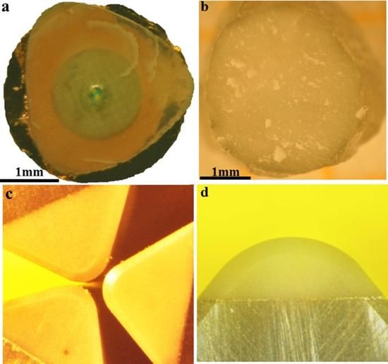 钻石-cBN合金样品和切割刀:a 和b: 在20GPa/2200o C条件下合成的直径为3毫米的合金样品,在铜屏幕显示出其透明性。c和d:钻石-cBN合金切割刀抛光的前刀面。(图片来源:D。 W。 He/SCU 四川大学)