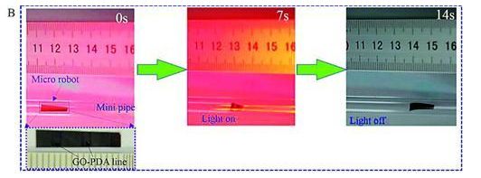 B图:一个石墨烯制作的微机器人在小管中用14秒受控爬行了几厘米。