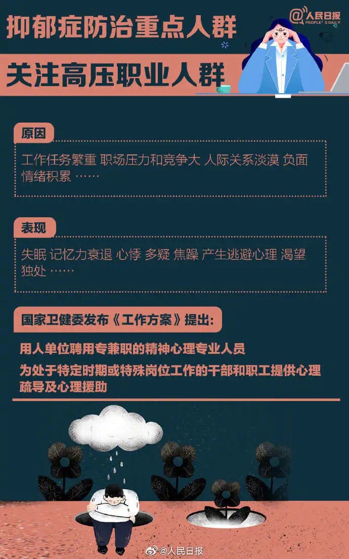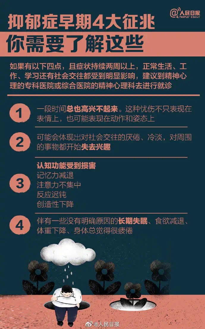 并不是出现了心情低落、兴趣减少的情绪状态,就是抑郁症了,要学会分辨抑郁情绪和抑郁症,如果每天处于低沉状态大于两周以上,同时影响了工作、生活,就要警惕抑郁症。