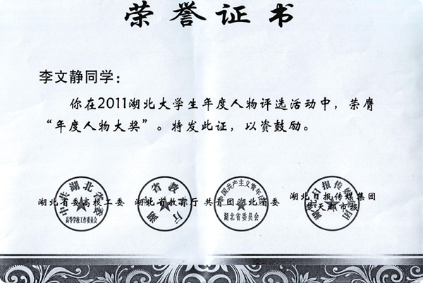 "2011 年湖北大学生年度人物"颁奖典礼于4月26日在湖北省楚天传媒大厦举行,备受关注的荆州"信义女孩"李文静榜上有名,学校领导、系部领导以及肖虹辅导员一起陪同李文静去颁奖,省政府资政段轮一为其颁奖。在回学校的路上,李文静说"今天获奖很激动,同时我感到很温暖,我的成长离不开大家的支持,虽然不幸,但一直在爱的呵护下长大,我愿意一直阳光下去,用我的微薄力量去将爱心传递。"