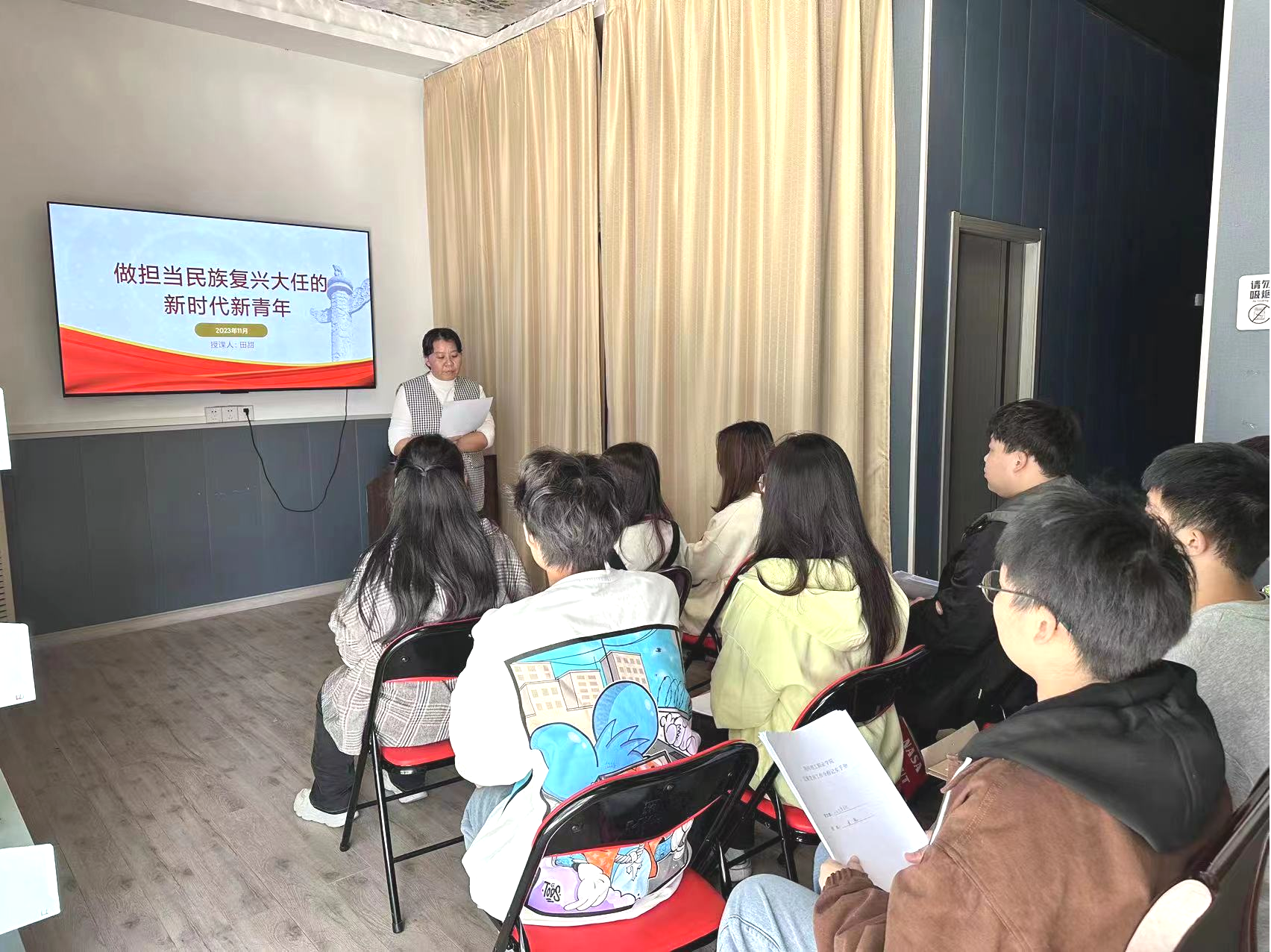 为引导青年学生深入学习习近平新时代中国特色社会主义思想,11月21日下午,文化创意学院副书记田甜以"做担当民族复兴重任的新时代好青年"为题进行了一场生动的主题教育,2023年下半年6名拟发展对象参加了本次培训。
