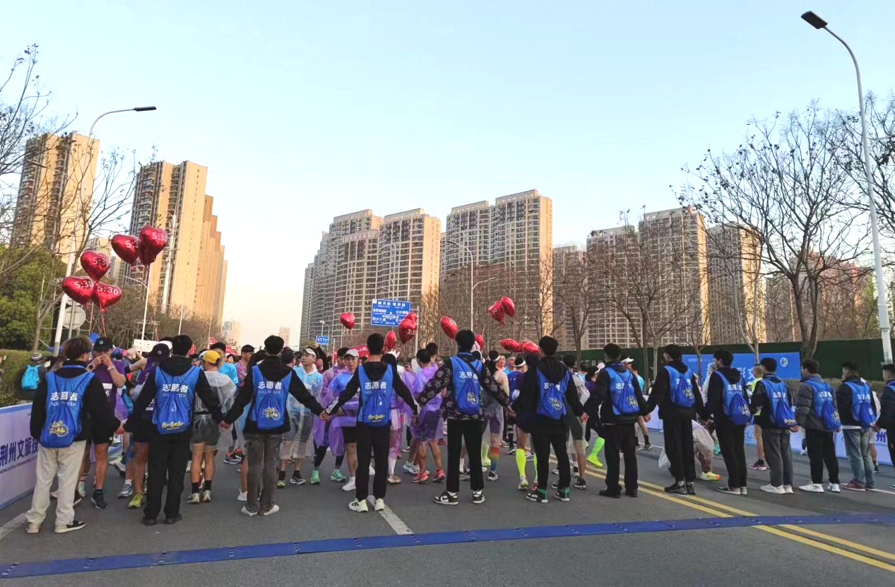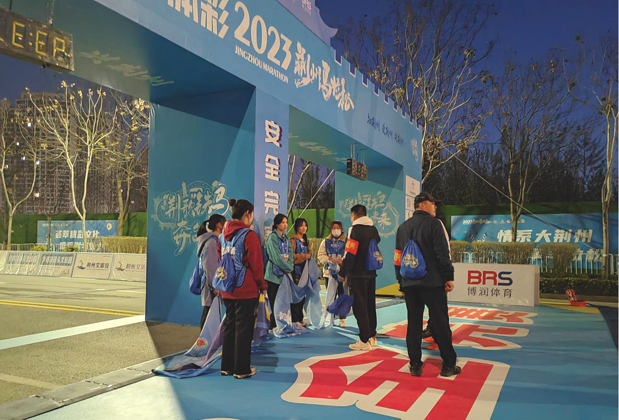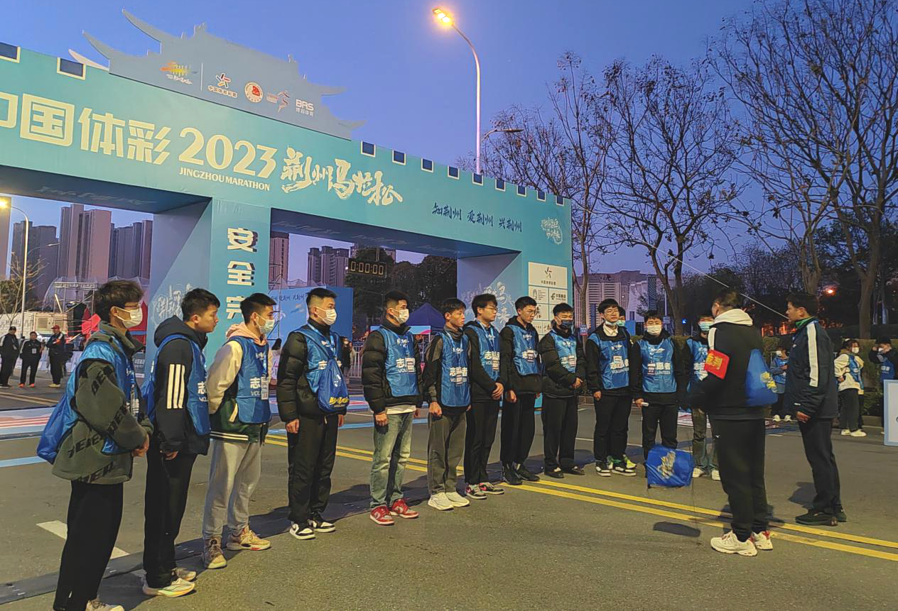 我院志愿者们负责赛事中的精英全程检录,在荆马裁判的安排下,16名男生志愿者组成人墙将A组和精英组分开,待鸣枪开跑后,志愿人墙跟随着人流跑并维持秩序。6名女生志愿者负责拉起点线,剩余志愿者协助安保人员做好疏导和指引工作。