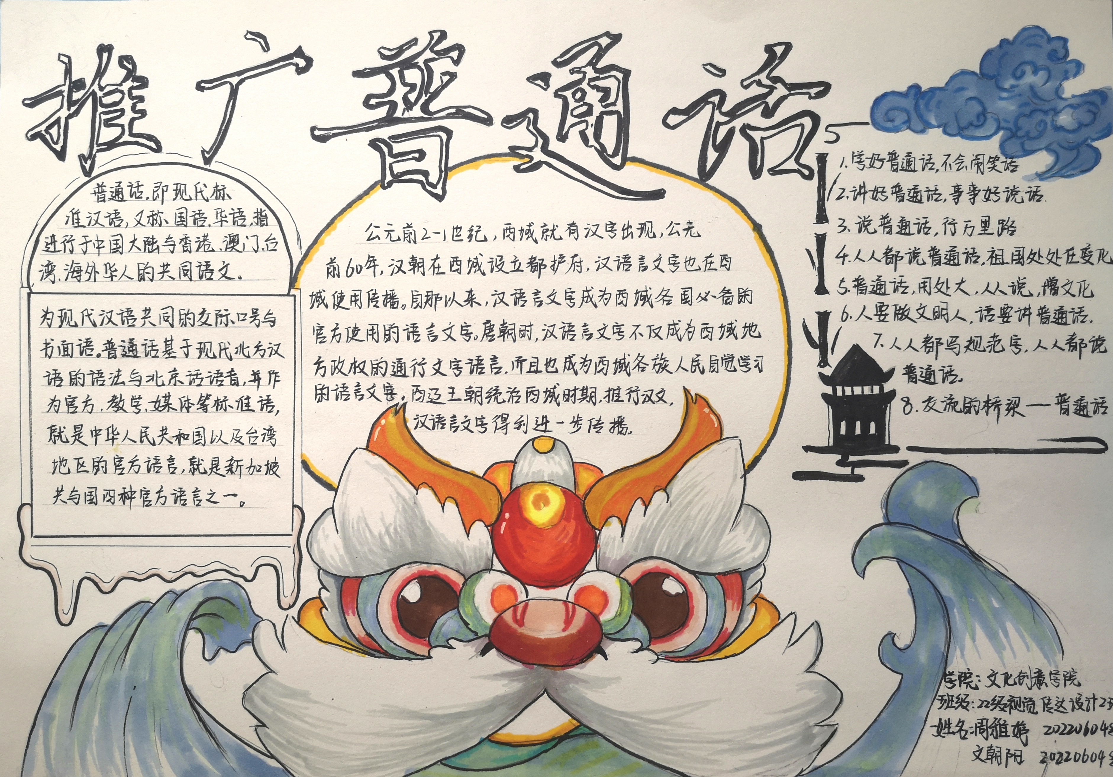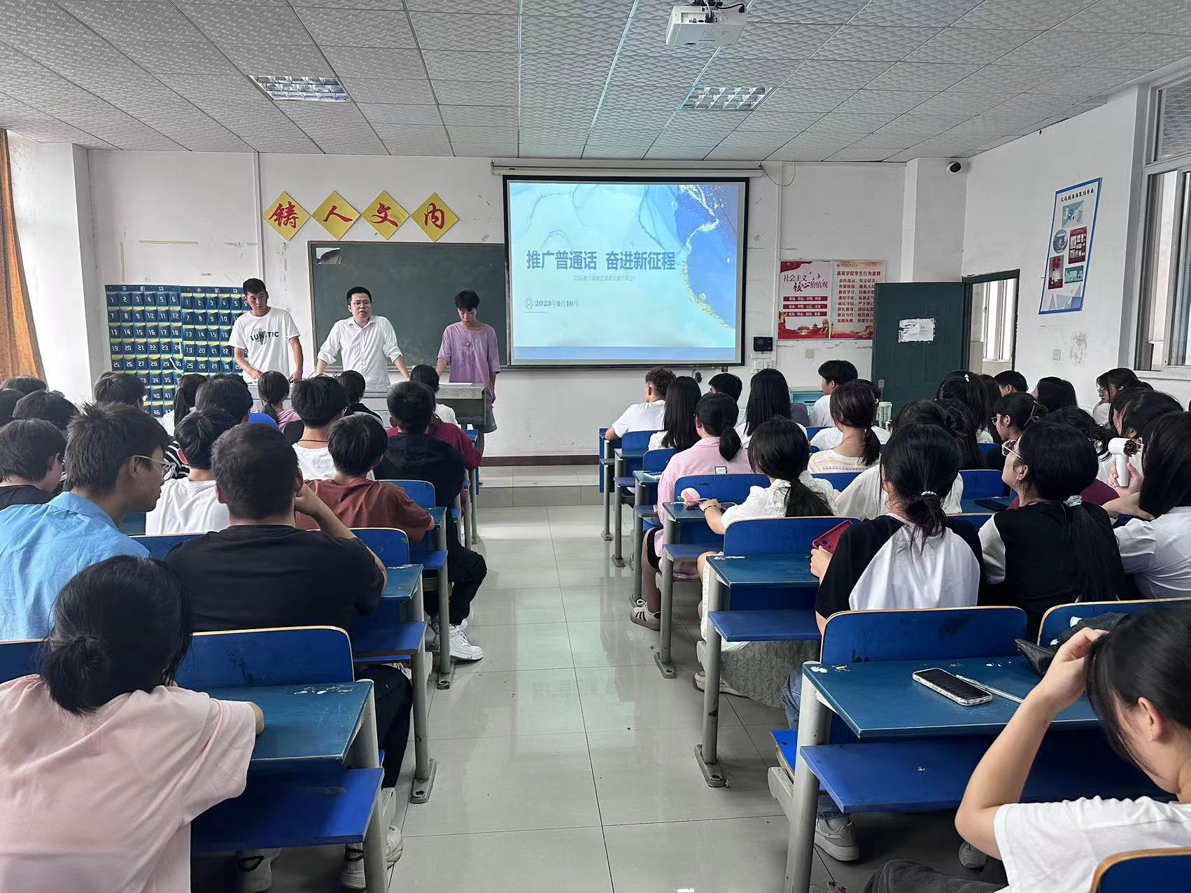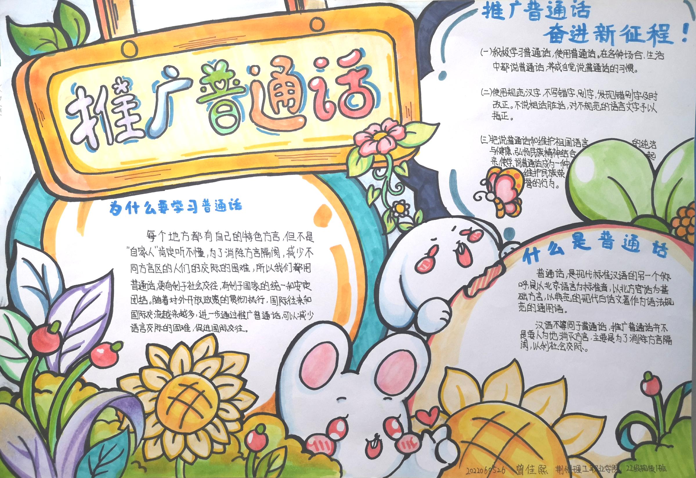 学院制作"说普通话、写规范字、做文明人"等宣传牌,并组织学生在校园内向师生发出"推广普通话,奋进新征程"的倡议,动员全体师生积极参与。各班围绕推普精神召开主题班会,在班级内宣传"推普周"活动。学生踊跃报名,以书法、绘画、手抄报、经典朗读等形式积极参与推普活动中,我院收到书法、绘画、手抄报等作品25件。