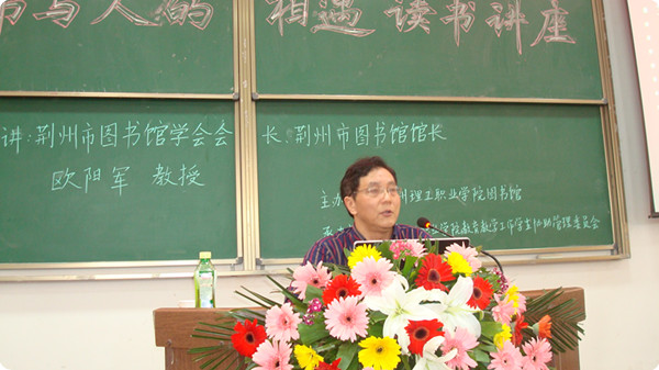 5月31日下午,我院图书馆邀请荆州市图书馆馆长、荆州市图书馆学会会长欧阳军来我校作了《为了书与人的相遇》专题讲座。在报告会上,欧阳军教授围绕为什么要读书、怎样读书、读什么书这三个问题,以他的亲身经历,紧密结合学生的实际,深入浅出地讲述了坚持读书和掌握知识的重要性。他运用了大量生动的事例说明了没有文化,就难以立足社会的道理。欧阳军老师语重心长地告诫大家:"要认真地读书,把书吃透,把人做好,要趁年轻尽量多地获取知识,通过大量阅读来积累知识,修炼自己,做一个真正的既有丰富的专业知识又有扎实的专业技能的一代新人。只有认真读书,以后才能创造未来,获得成功"。他希望青年学子,在读书的过程中注意独立人格的培养和君子品行的修炼。