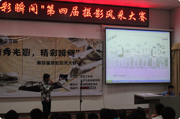 (人文与社会科学系报道)为了使摄影知识广泛普及,让更多的摄影爱好者拥有一个平台展示自己,5月25号(上周五)晚上6:30分由学生工作处、人文与社会科学系主办,阿波罗摄影协会承办的"毓秀光影,精彩瞬间"第四届摄影风采大赛在院阶梯教室拉开帷幕。
