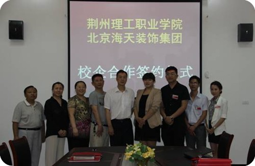 5月24日上午, 我院与北京海天装饰集团校企合作签字仪式在学院酒店管理实训基地会议室举行。副院长田远芬、评建办主任郭建农、人文与社会科学系书记吴叙敏、系主任喻方琪、系副主任夏路、北京海天装饰集团人力资源部主任江青燕、材料部主任周爱强、行政部经理唐以评、销售部经理李彬出席了签约仪式。