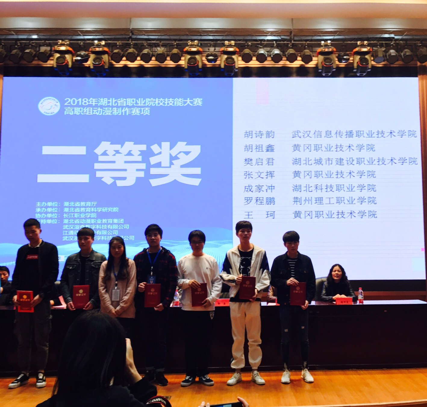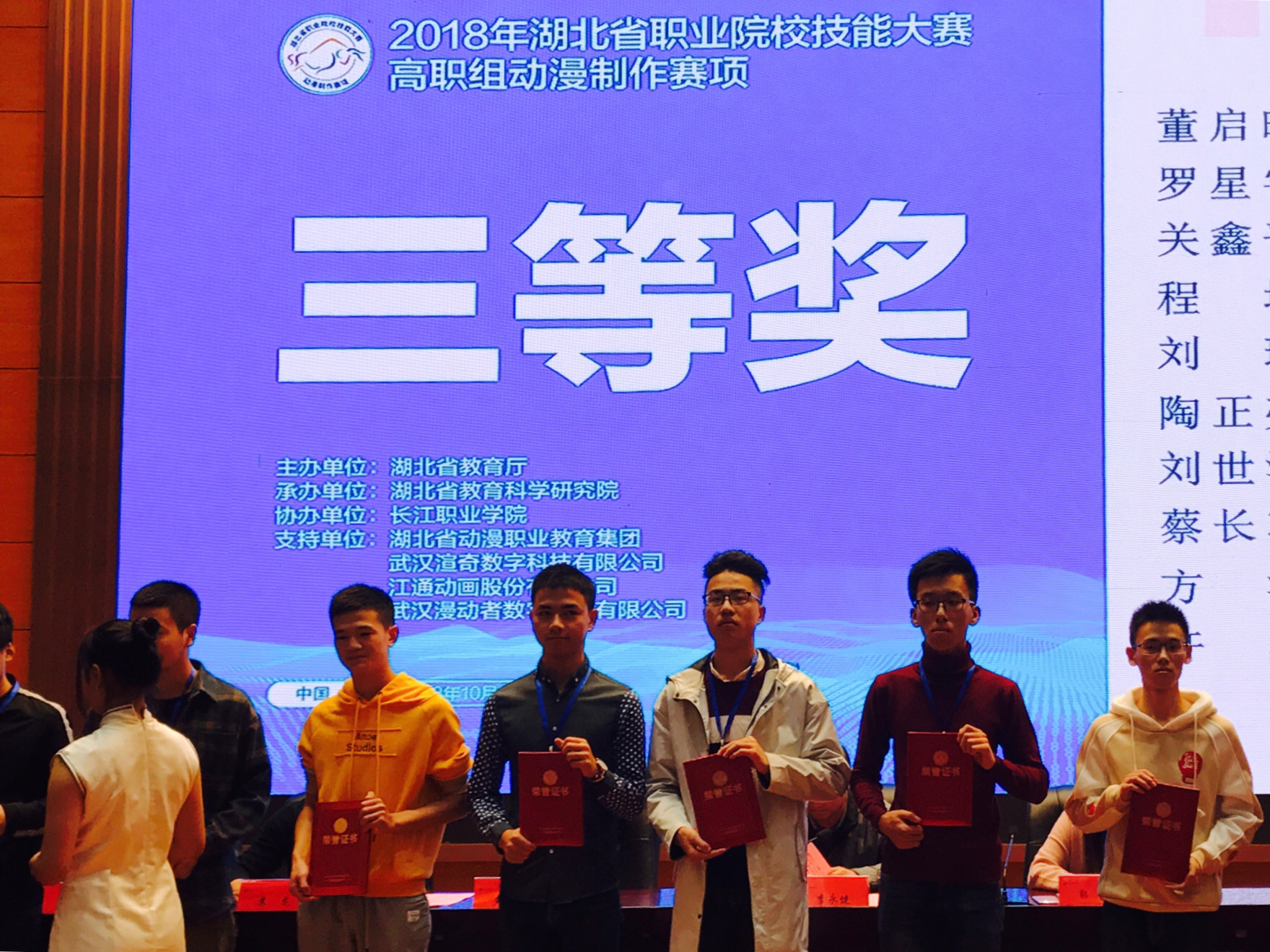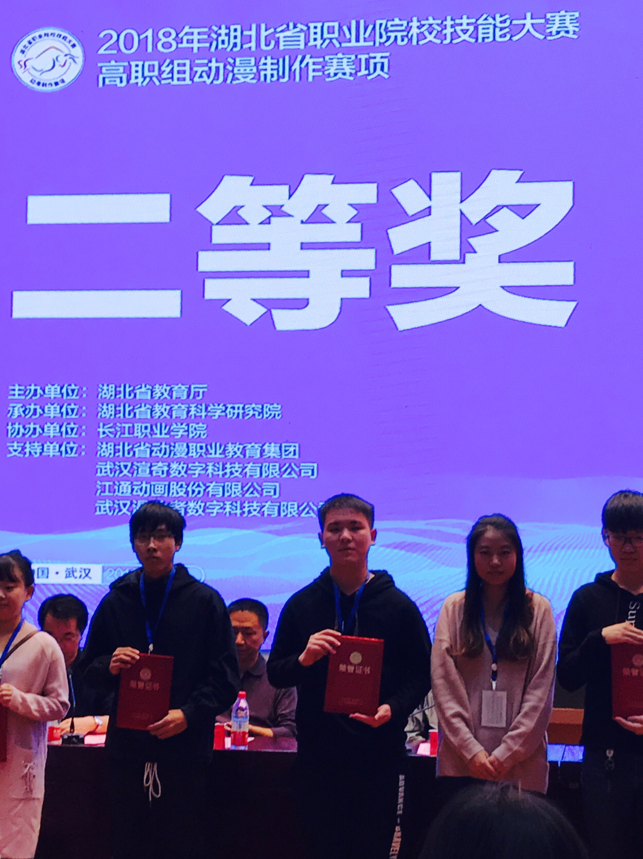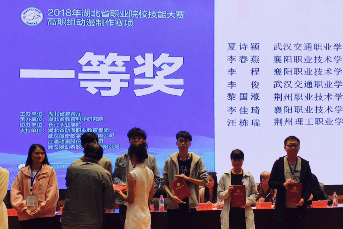 2018年10月25日,我院3名教师带领6名参赛学生赴长江职业学院报到参加湖北省职业院校技能大赛。其中,院长高元华、教师程绍柏为高职组动漫制作赛项指导老师,教师高旺为赛项参与评委。26、27日,推荐组和抽测组分别3名学生开始了连续8小时全封闭的紧张比赛。经过指导老师为期三个多月的辛苦指导以及学生废寝忘食的训练,我院选手终于在竞争激烈的省赛中取得喜人的成绩。动漫制作赛项获奖情况如下: