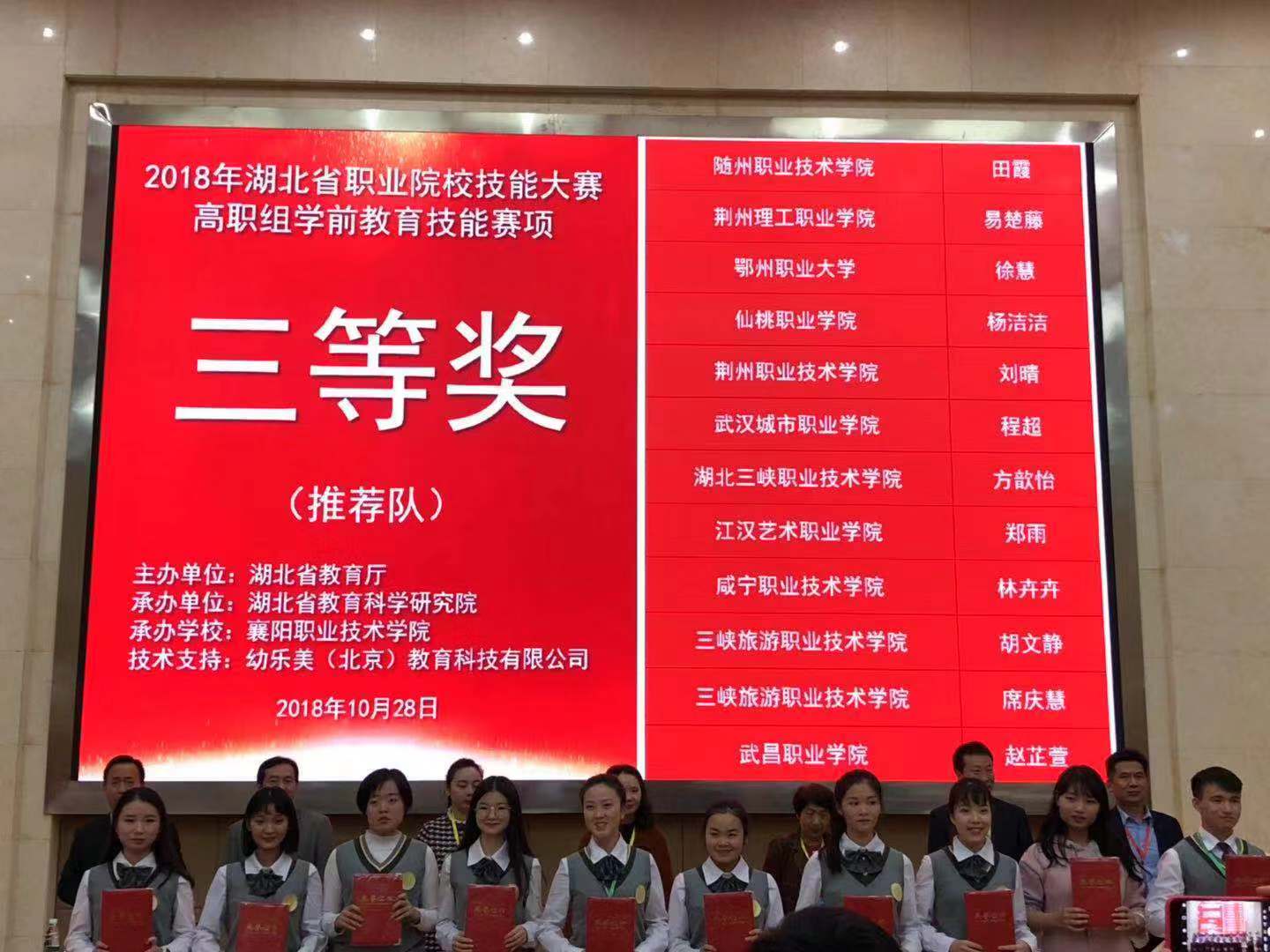 2018年10月25日,我院4名教师带领4名参赛学生赴襄阳职业技术学院参加湖北省职业院校技能大赛。其中,书记张朝强、教师郑宇鸣、李子琪为高职组学前教育赛项指导老师,教师姚妙妙为赛项参与评委。经过指导老师数月的辛苦指导以及学生废寝忘食的训练,在27、28日,推荐组和抽测组分别2名学生开始了连续12小时全封闭的紧张比赛,最终在竞争激烈的省赛中收获喜人的成绩。学前教育赛项获奖情况如下: