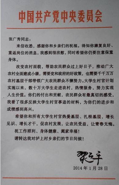 习近平一向十分重视大学生"村官",他不仅在天津、江苏等地考察时与大学生"村官"亲切交谈,还曾就大学生"村官"问题进行讲话。回复信件、群发短信——这两样虽然让大学生"村官"们有点"意想不到",却也是一种无比温情的鼓励和鞭策。