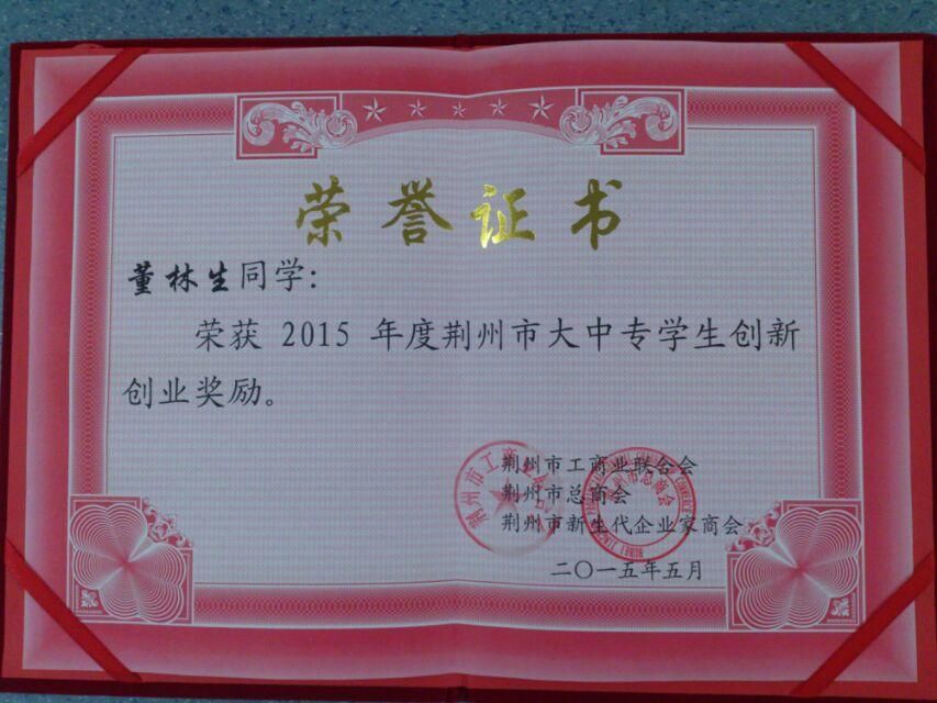 5月6日,由荆州市工商联、荆州市总商会组织举办的荆州市领导与新生代企业家、荆州市优秀创业创新大中专学生交流会在荆州市盟达酒店四楼多功能会议室隆重举行。我系经济管理系董林生荣获荆州市优秀创新创业大学生荣誉证书,并获得荆州市优秀大学生创新创业奖学金8000元,荣获佳绩。